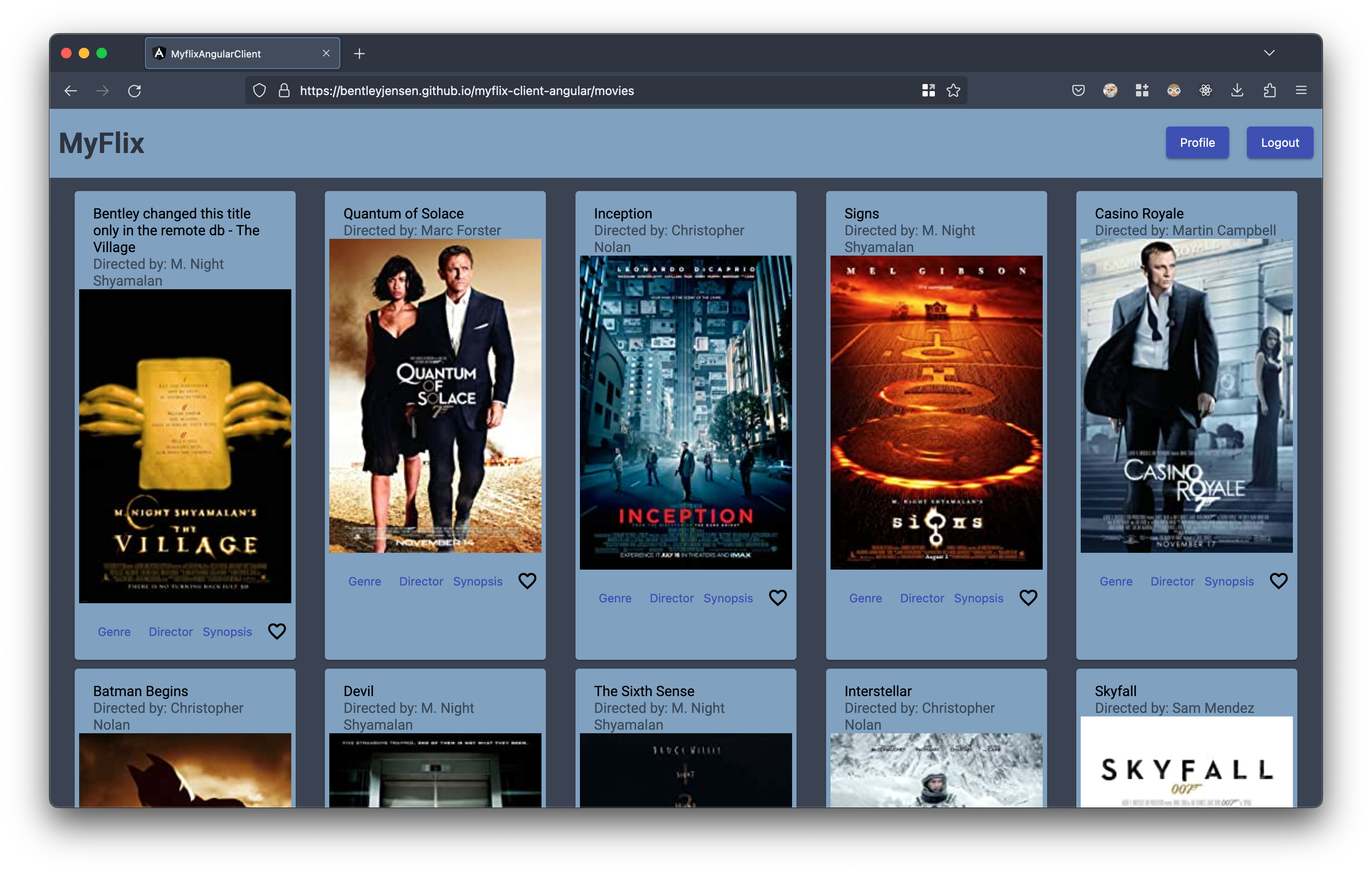 Built to work with the MyFlix API, this frontend is built in React and bundled with parcel. Browse movies, save favorties, and update user info. Hosted by Netlify.