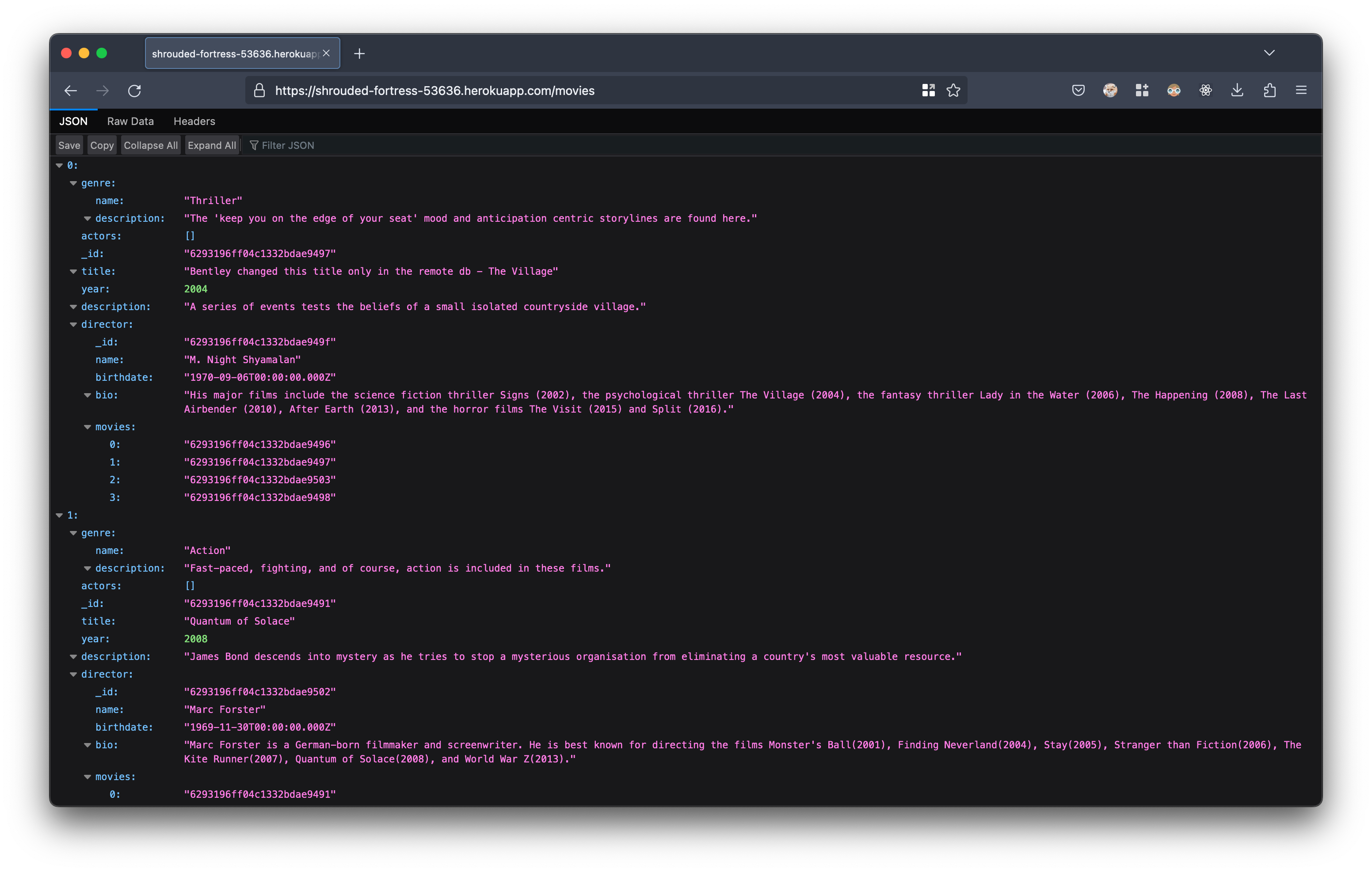 This API is built with a MongoDB instance behind it, implements full authorization through Passport, and has JSDoc for easy endpoint documentation. Currently Hosted by Heroku. It serves movies, similar in spirit to IMDB.
