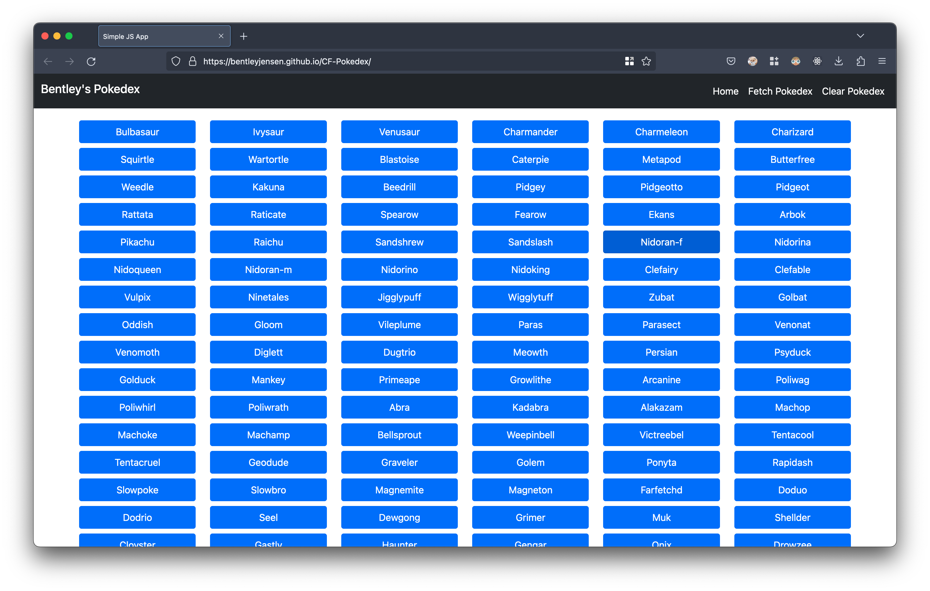 This project was focused on learning to use Bootstrap, jQuery, and interact with an external API. It has a responsive layout and works with a public Pokemon API. Dig through and pick a pokemon to see a picture of it and some details.